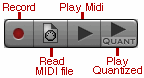 These controls allow you to Record MIDI from your keyboard, Read Standard MIDI files (created by other music applications), playback the original recording (or imported MIDI file), and playback the quantized recording (or imported MIDI file).