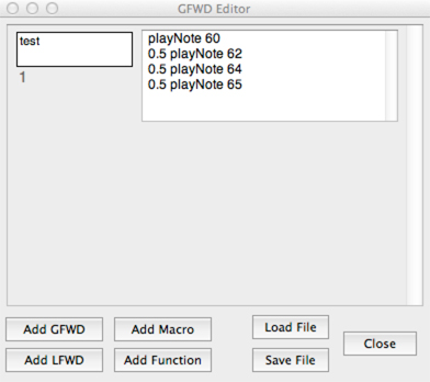 It is also possible to add additional GFWD or LFWD messages, macros, and functions by clicking on the buttons on the GFWD Editor panel. If you are adding these messages, you will need to include both a reference name (on the left side of the panel) and the code associated to that reference (on the right side of the panel.) Once these have been entered, you can create connections to the code by returning to the score and typing the reference name in a new GFWD or LFWD object.