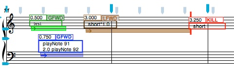 The LFWD messages are created in a similar way to the green GFWD messages except that the reference name entered in the score must end with a "*n" designation which indicates the length of the loop in beats. For example "short*2.0" as a LFWD name would indicate that the loop should be repeated 2.0 beats. The LWFD loop will continue until there is a KILL object with the same name as the LFWD name (without the *n addition). In other words, we need a KILL object named "short" in order to stop the loop.