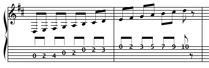 The example below shows a D Major scale in both conventional notation and in guitar tablature.