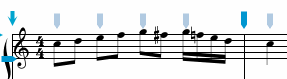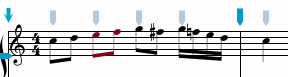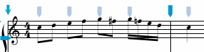 In the example below the notes were entered at pointsize 24 (the default size), then the notes were selected, the image size slider adjusted to 18 pointsize and the Set Size button clicked. You can see that the size of the images is smaller, but none of the other characteristics (length of stem, beam angle, horizontal or vertical position) has changed.