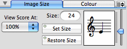 Clicking on the Set Size button causes the pointsize of all selected images in the score to be altered. The Restore Size button sets the Size: field and the slider to the default size - 24 point.