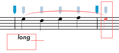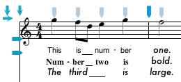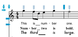 The Extend Underscore button extends an underscore from the first selected lyric image to the first selected note image. Underscore are used to indicate that syllables are held for more than one note (as in "third__" in the example above.) The Remove Underscore button removes all underscores that begin on the selected lyrics. In the example below, the lyric syllable and the last note in the passage were shift-selected, and the Extend Underscore button was clicked.