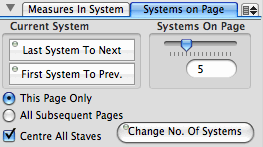 To change the number of systems on the page, set the new number of systems by typing the number into the text field or moving the slider. Set whether you want the number of systems changed only on the current page or on the current page and all subsequent pages. If you want all the staves on the page adjusted so they are equidistant after the number of systems have been changed, check the Centre All Staves check box. Once you have set all of the above, click on the Change No. Of Systems button. Systems will be wrapped from page to page as needed, and new pages will be added at the end of the document if required.