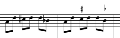 The Double Sharp, Sharp, Natural, Flat, Double Flat, Quarter Flat, and Quarter Sharpmenu items are used to change the accidentals of selected notes to the indicated accidentals. Normally, redundant accidentals within the measure are not repeated. In the example below, all notes were selected and the Sharp menu item was choosen.