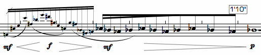 The Tick Barlines On/Off menu item changes the barline format of the current measure (i.e. the measure that the Entry Cursor is on) between normal barlines and tick barlines. Tick barlines consist of a small red mark just above the top line of the staff. Tick barlines are useful in scores using timing rather than conventional measures. The example below shows a score with tick barlines.