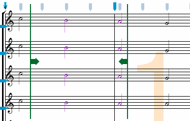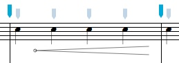 It is also possible to use these menu items to create crescendi or descrescendi across many staves. In this case, select several staves with the Select Score arrows by placing the start arrow on the first staff and the end arrow on the last staff that you want included. A crescendo or decrescendo will be added to each staff. The example below should make this clear: