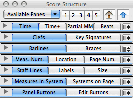 The Score Structure panel contains extensible rows of panes which can be used for modifying the underlying musical structure of your score or for performing some of the more advanced editing procedures. The pull-down menu at the top of the panel (entitled Available Panes) allows you to add or remove panes from the panel. A check mark in the pull-down menu indicates which panes are included in the pane and can be removed - the absense of a check mark means that pane can be added. A total of 10 panes can be stored in the Score Structure panel. In the example below, 7 panes are included in the panel.