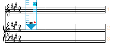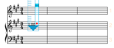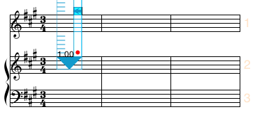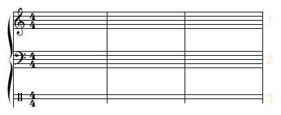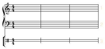 In the following examples, we begin with a system of 3 staves (with staff spacing set to 4 ledger lines.)