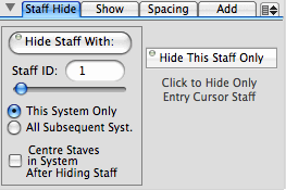 The Staff Hide tab view is used to hide staves that you don't want displayed in system, and the next tab view (Show) is used to show previously hidden staves. Normally, this panel is used to hide empty staves if you want only the staves with music on them to appear in the score.
