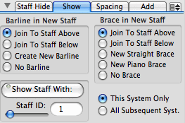When a new staff is added it is possible to specify whether it will have a new brace or is joined to the brace group above or below, and likewise whether it will have a separate barline or whether the barline is joined to the staff above or below. These specifications must be set in the Staff Show tab view before the new staff is added. The relevant portions of the Staff Show tab view are shown below:
