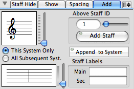 The Staff Add tab view is used to add more staves to your score. The new staff can either be inserted in the middle of a system or appended to the bottom of the system.