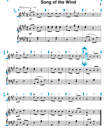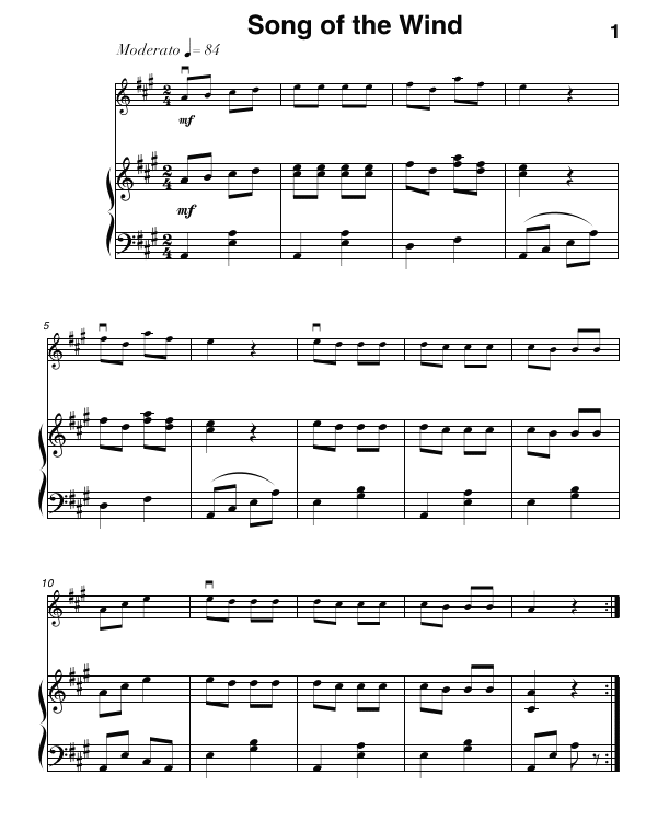The first composition is short folk song for violin and piano entitled Song of the Wind. It will be familiar to all those who have studied the Suzuki violin method. The finished composition is shown below.