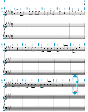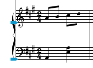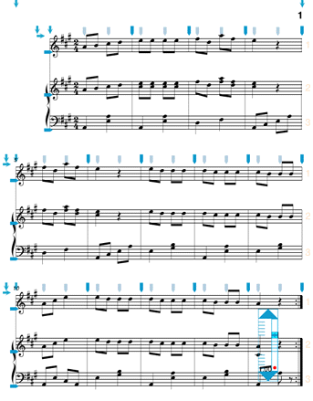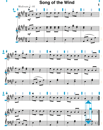 You might also want to adjust the distances between two piano staves in your score. This can be done several different ways in NoteAbilityPro, but we will start with the simpliest and most direct way. You can manually adjust the position of the second piano staff (in each system) by grabbing and dragging (in an upward direction) the button which is at the right edge of the bottom staff line. As you drag the staff, the position of the images on this staff will adjust. Move the bottom staff closer to the staff above in each of the three system