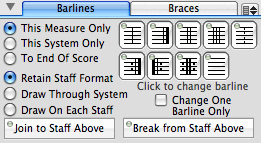 The final barline of the composition is a repeat barline, so you should position the Entry Cursor in this measure and locate the Barline & Braces pane from the pull-down menu in the Score Structure panel.