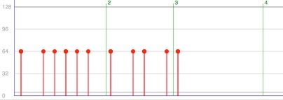 Clicking on the Load Notes button loads all selected notes into the panel where their playback velocities are displayed. All notes are displayed against a background which shows the measure numbers and barlines. The horizontal zoom of the display can be altered using the zoom in and zoom out arrows at the bottom of the panel. The example below shows a selected group of notes and its appearance in the Velocity Editor: